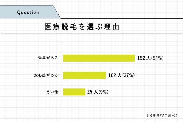 質問2では、質問1で「医療脱毛・皮膚科」と回答した人にその理由を尋ねたところ、最も多かった回答が「効果がある(152人・54%)」で、2番目に多かったのが「安心感がある(102人・37%)」だった。(グラフ2)